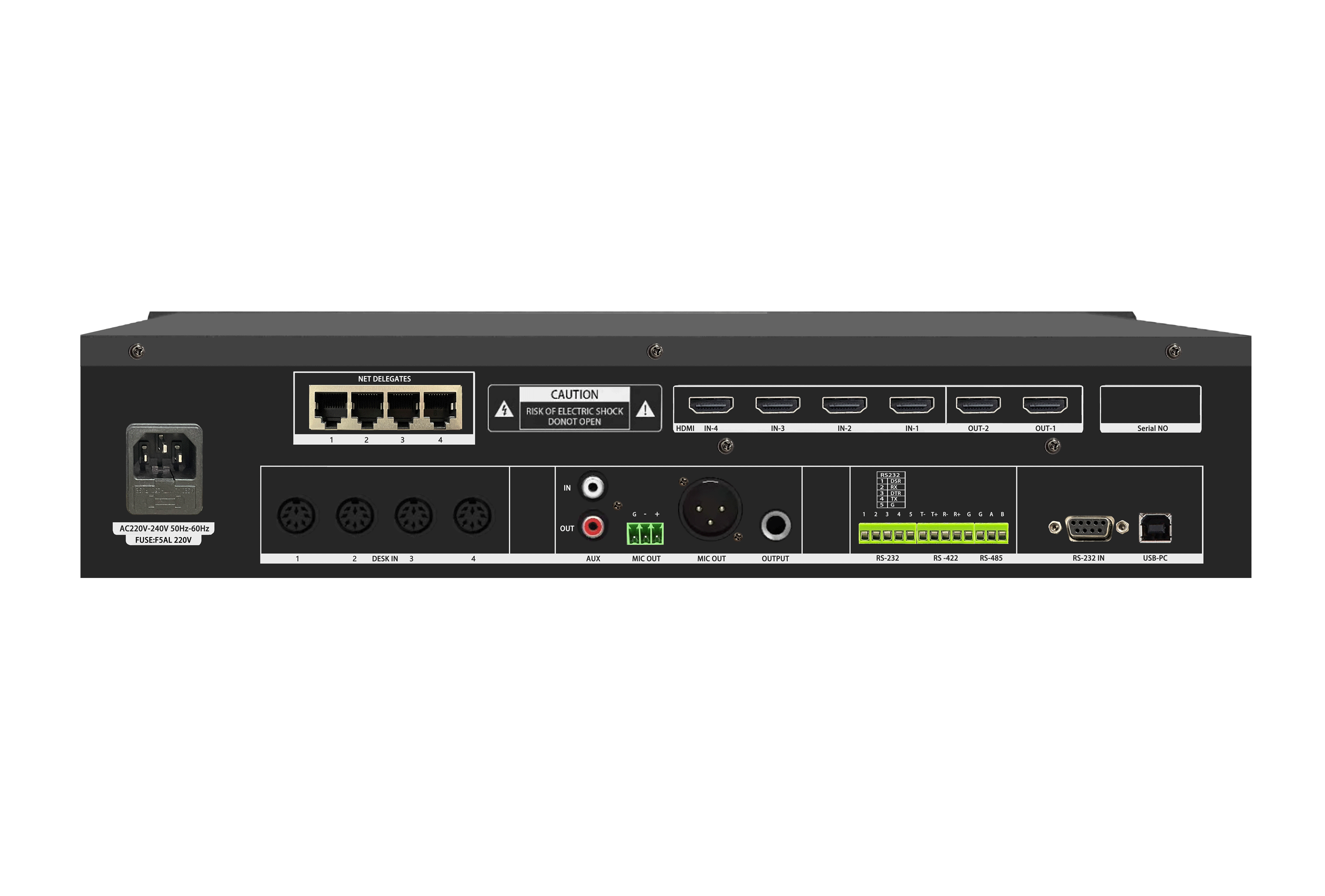 u 具有4路RJ45的會議單元接口,采用環(huán)形鏈接模式,每路支持30個單元,可接120個單元。